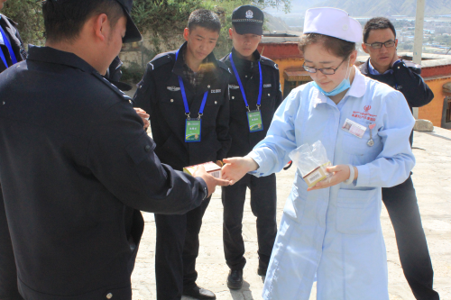 8月14日上午,阜康醫(yī)院組織起一支醫(yī)療小分隊(duì),攜帶各種藥物與電子血壓計(jì)等醫(yī)療器械,在醫(yī)務(wù)科副主任黃川川及歐醫(yī)生等人的帶領(lǐng)下,奔赴哲蚌寺,步行走過寺廟各大角落,為駐守哲蚌寺各條線路的廣大執(zhí)勤民警送醫(yī)送藥,送去關(guān)懷。