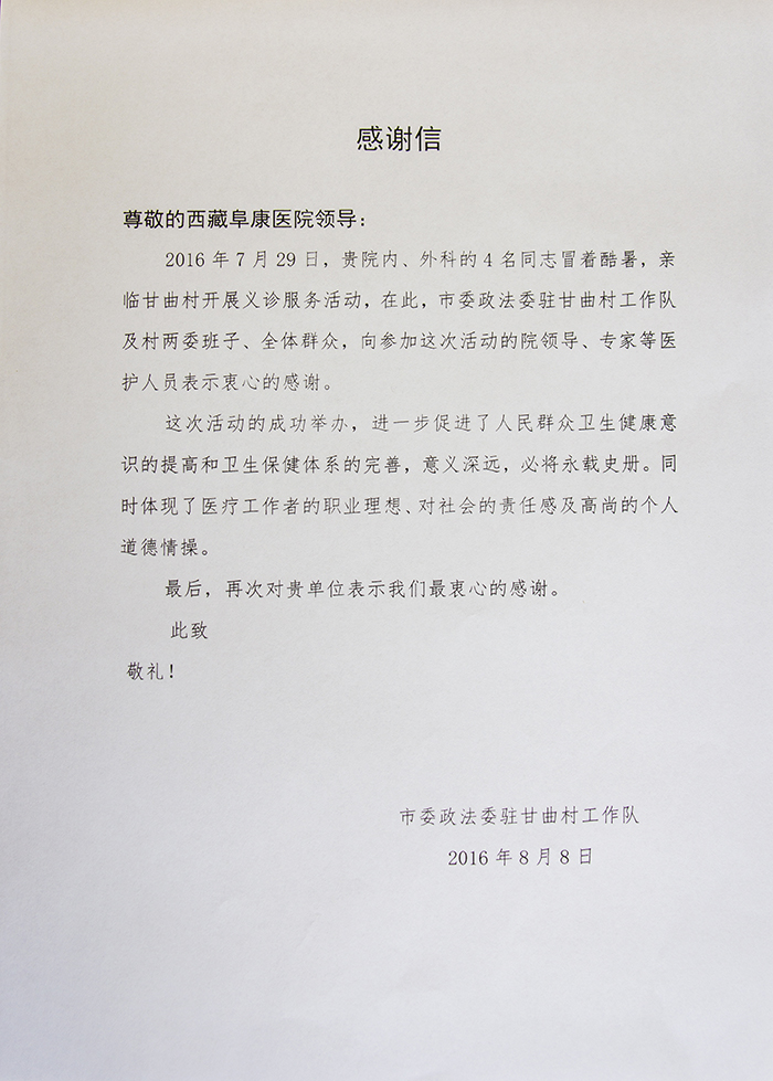 2016年7月,林周縣朱加村村委會、甘曲村村委會受當(dāng)?shù)卮迕袼?,與林周縣人民醫(yī)院和西藏阜康醫(yī)院相關(guān)負(fù)責(zé)人取得聯(lián)系,希望能夠派遣醫(yī)療義診隊為當(dāng)?shù)卮迕衩赓M義診。7月29日經(jīng)相關(guān)領(lǐng)導(dǎo)協(xié)調(diào),西藏阜康醫(yī)院派出了由外科專家李玉仲、內(nèi)科專家劉占懷及幾名護(hù)理人員組成的義診小分隊先后前往朱加村、甘曲村為當(dāng)?shù)卮迕衩赓M義診。