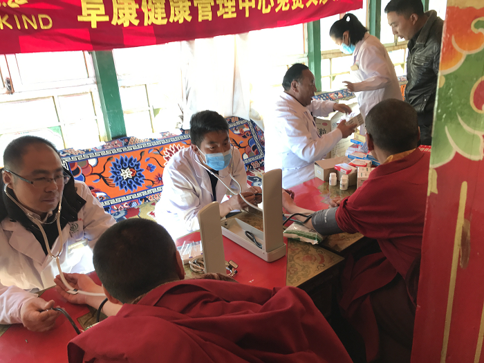 隨后,義診活動井然有序地開始了,張院長和田豐輝醫(yī)生負責測血壓,護士唐宗青測血糖,瓊瑪負責發(fā)放藥品,占堆(我院體檢中心醫(yī)務人員)對每一位血壓、血糖高的僧人、群眾進行登記,有利于以后對他們的健康進行隨訪跟蹤,了解他們有無不適以及血壓、血糖情況,督促他們的按時服藥、并指導他們健康的生活方式。在義診體檢過程中,一名76歲的老人,血壓200/120mmHg,經過詢問,老人身體并沒有不適,在詳細的給老人講解了高血壓對身體健康的影響,以及高血壓帶來的危害后,并給予老人免費發(fā)了治療高血壓的藥物,囑咐他這幾天要每天規(guī)律服用降壓藥物、監(jiān)測血壓,直至血壓在正常范圍后可以改為三到五天測一次血壓,但降血壓藥物不能停止,老人欣然接受意見,并握手致謝。