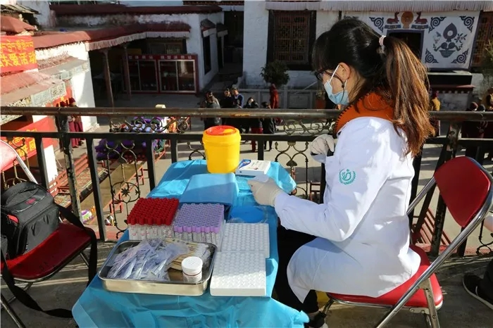 上午8點(diǎn),朱主任一行人分別從阜康婦產(chǎn)兒童分院和阜康健康體檢中心兩路出發(fā),經(jīng)過一個多小時的路途顛簸,于9點(diǎn)15分到達(dá)雄色寺,尼眾和駐寺干部們早已等候在寺廟庭院內(nèi)。由于體檢項(xiàng)目中有血液檢查,不能進(jìn)食,為了不讓尼眾和干部們?nèi)甜囂?,朱主任一行人到達(dá)雄色寺以后,快速整理現(xiàn)場,將所用儀器與藥品一一擺放整齊,在區(qū)婦聯(lián)領(lǐng)導(dǎo)講話以及受邀律師宣講完畢以后,立刻投入為各位尼眾與干部體檢的工作當(dāng)中。