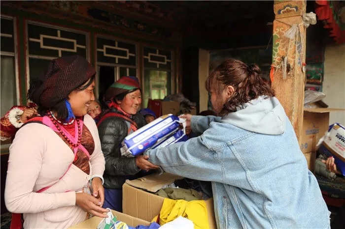 西藏阜康天使基金會(huì)副秘書長(zhǎng)吉拉女士向村民贈(zèng)送生活用品