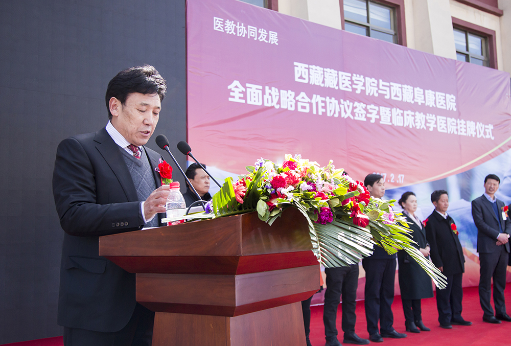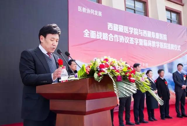 隨后,王斌董事長在儀式中發(fā)表講話,全面介紹了西藏藏醫(yī)學(xué)院及西藏阜康醫(yī)院的發(fā)展歷程,并表示西藏藏醫(yī)學(xué)院和西藏阜康醫(yī)院達(dá)成全面戰(zhàn)略合作,旨在進(jìn)一步加強(qiáng)雙方戰(zhàn)略合作關(guān)系,雙方將在良好的合作和互信基礎(chǔ)上,本著“優(yōu)勢互補(bǔ)、資源共享、互惠互利、合作共贏”的原則,重點在人才培養(yǎng)、科學(xué)研究、學(xué)科建設(shè)、醫(yī)療服務(wù)等方面開展長期合作,提升雙方在醫(yī)療、科研、人才培養(yǎng)及社會服務(wù)等方面的綜合水平;王斌董事長還表示,為培養(yǎng)應(yīng)用型醫(yī)學(xué)人才,西藏阜康醫(yī)院特在西藏藏醫(yī)學(xué)院設(shè)立了30萬元助學(xué)、助教基金,用于幫助學(xué)習(xí)優(yōu)秀卻又家境貧寒的莘莘學(xué)子和鼓勵辛勤耕耘的優(yōu)秀教師。