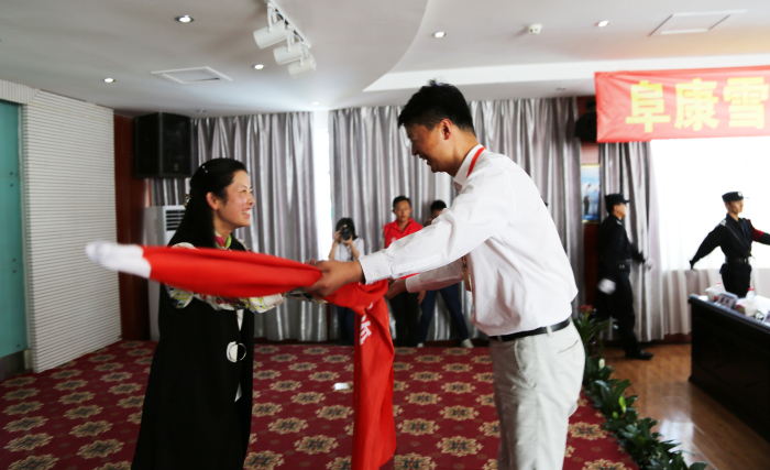 西藏志愿服務(wù)聯(lián)合會副秘書長為阜康雪域天使志愿者服務(wù)隊(duì)授予隊(duì)旗