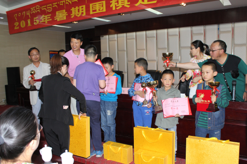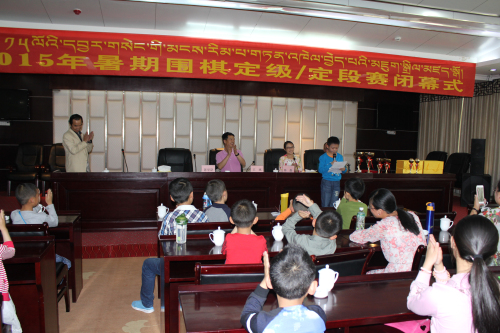 7月28日, 拉薩市2015年暑期圍棋定級/定段賽頒獎儀式在拉薩棋院三樓會議室召開,出席嘉賓有拉薩棋院院長王斌、拉薩棋院秘書長及職業(yè)圍棋隊教練陳盈女士、拉薩棋院圍棋部副主任趙鈞、棋院老師陳學(xué)滸及本次參賽的學(xué)生和家長。首先王斌院長代表拉薩棋院歡迎大家的到來。從今年4月26日拉薩棋院成立到現(xiàn)在不到半年的時間,就已經(jīng)在5月1日、2日成功的舉辦了“2015春季‘阜康杯’拉薩市少兒圍棋定級賽”,并得到了各界的大力支持和認同。為了改善棋手們的學(xué)棋環(huán)境,棋院又投資數(shù)萬元購置棋桌、棋盤等設(shè)施,棋院在每間教室的休息區(qū)均安裝了WiFi。據(jù)王斌院長介紹,棋院準備接下來培養(yǎng)更多的圍棋老師到各大幼兒園、小學(xué)教授圍棋,待辦學(xué)條件成熟還可能增加書法等項目,讓西藏的適齡小孩得到更多的琴棋書畫的熏陶及教育。
