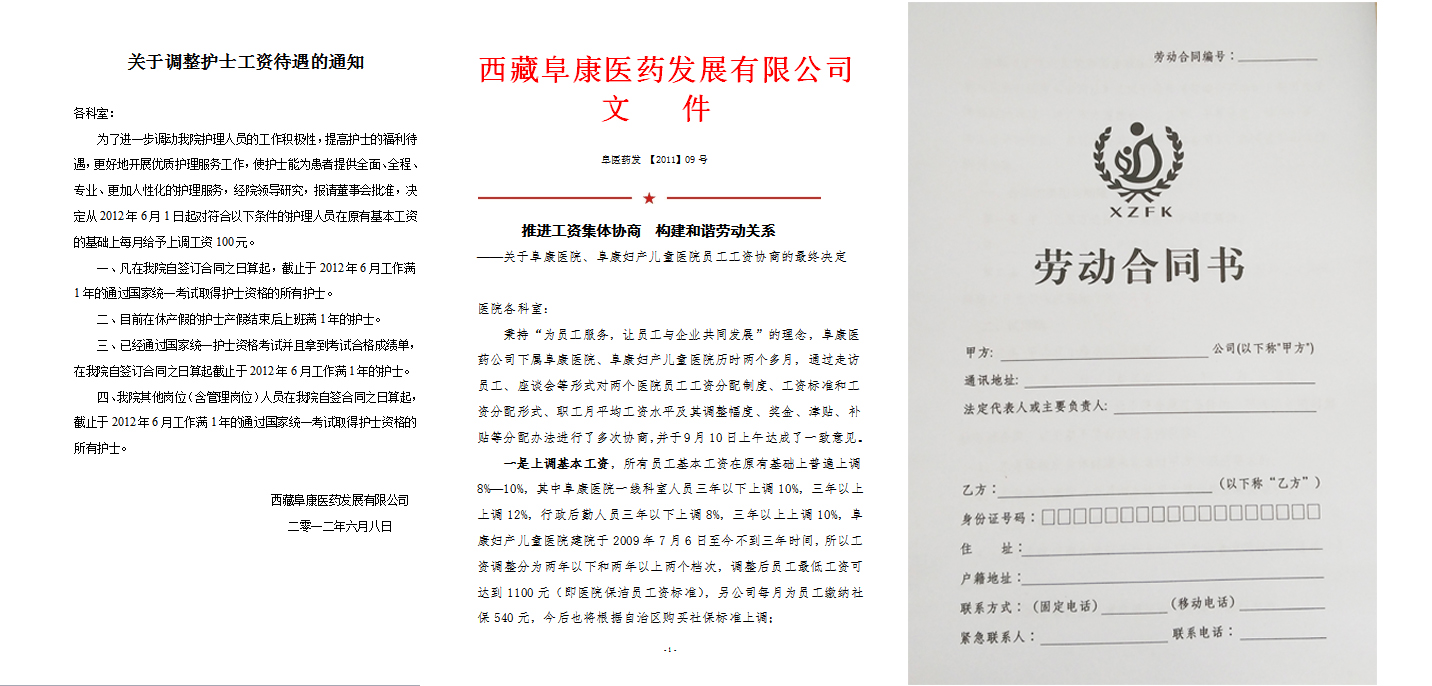 近年來,西藏阜康醫(yī)療股份有限公司高度重視工資集體協(xié)商工作,始終堅持以人為本,維護職工合法權(quán)益,認真貫徹《集體合同規(guī)定》。實行院務公開,發(fā)揮職代會作用,認真聽取員工在工資集體協(xié)商方面的意見和建議,根據(jù)需要召開職代會聯(lián)席會議,建立穩(wěn)定的分配機制和增資機制,保障了員工對公司工資分配的知情權(quán)、協(xié)商權(quán)和監(jiān)督權(quán)。認真履行《勞動合同》,設立了員工養(yǎng)老、醫(yī)療、工傷、生育、失業(yè)等保險,并足額上繳到位。