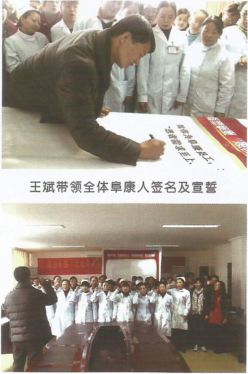 當(dāng)日下午,筆者在兩家醫(yī)院看到,西藏阜康醫(yī)藥超市和兩家醫(yī)院的全體醫(yī)護(hù)人員乃至醫(yī)院的保安都在“患者需求至上,團(tuán)隊(duì)精誠(chéng)協(xié)作”的大型橫幅上簽上了自己的姓名。王斌董事長(zhǎng)說(shuō):為了讓醫(yī)院全體人員時(shí)刻牢記“病人至上”的理念,通過(guò)簽名的方式時(shí)刻刺激醫(yī)院?jiǎn)T工服務(wù)意識(shí)的神經(jīng),從而達(dá)到“服務(wù)來(lái)自于心”的效果。