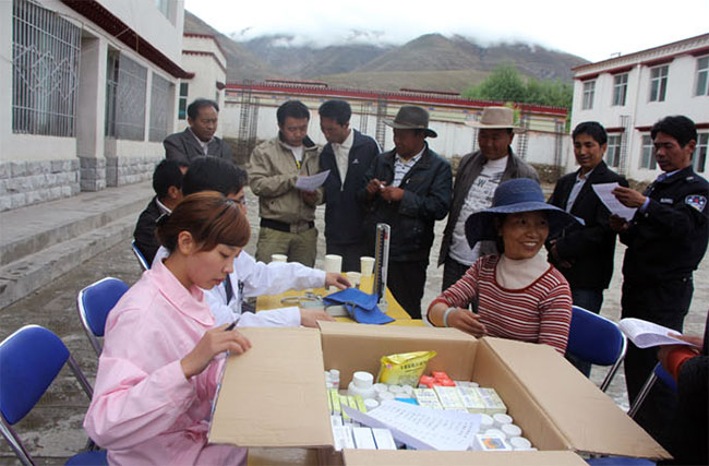 通過(guò)為尼木縣鄉(xiāng)村小學(xué)老師們的體檢,董發(fā)善醫(yī)生說(shuō):“大部分老師都患有血管神經(jīng)性頭疼和不同程度的胃病和膽囊疾病。這是由于在鄉(xiāng)村學(xué)校中,老師們工作繁忙,經(jīng)常忘記吃飯或者到了吃飯的時(shí)候就湊合吃幾片風(fēng)干肉,喝幾杯酥油茶。這是造成鄉(xiāng)村老師腸胃和膽囊疾病的主要原因。此外,由于老師們經(jīng)常站著講課,腰椎疾病的患病率比其他行業(yè)的要高。”在體檢的同時(shí),醫(yī)護(hù)人員還向老師們發(fā)放了常見疾病預(yù)防知識(shí)的宣傳材料。