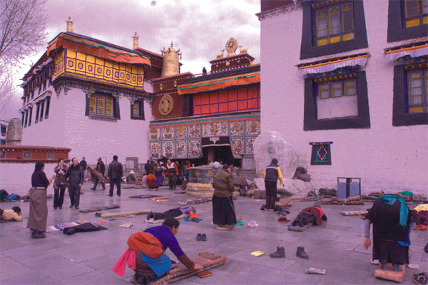 前幾天在大昭寺廣場(chǎng),看人們磕長(zhǎng)頭。人很多,其中多數(shù)應(yīng)該是牧區(qū)上來的,臟亂的衣服,掩不住滿眼的虔誠(chéng)。有的人累了,便坐在那里和身邊的一或兩人輕聲地說話,大多數(shù)人,則是重復(fù)著相同的動(dòng)作:面向大昭寺,不停起身,然后跪倒全身俯地……從早到晚,日復(fù)一日,簡(jiǎn)單而長(zhǎng)久。