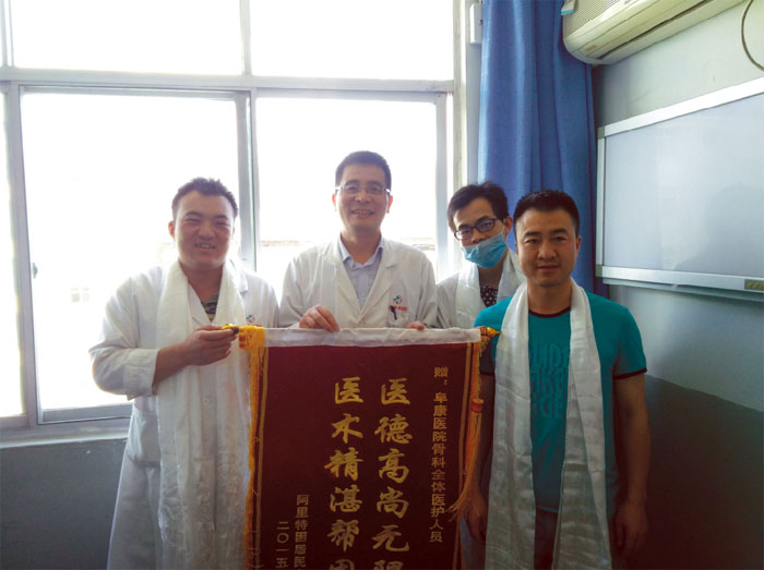 2015年5月23日,外一科收治一名來自曲樂鄉(xiāng)尼雄二村名叫扎西(化名)的病人,診斷為右脛骨開放性粉碎性骨折并大面積皮膚壞死,住院63天,共四次手術。因經濟困難,無法承擔所欠的四萬兩千余元。向上級領導匯報后,王斌董事長指示:先治病,所欠費用由雪域天使基金會補充。出院當天,患者及家屬為我院骨科醫(yī)生獻上哈達和錦旗以表感謝之情。