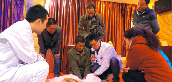 2016年3月24日,我院受邀于國網(wǎng)西藏直孔發(fā)電公司開展緊急救護(hù)培訓(xùn),由內(nèi)科醫(yī)生盤允、急診科護(hù)士肖明洋分別就“創(chuàng)傷院前急救技術(shù)”及“心肺復(fù)蘇概述”等相關(guān)專業(yè)知識進(jìn)行講解。