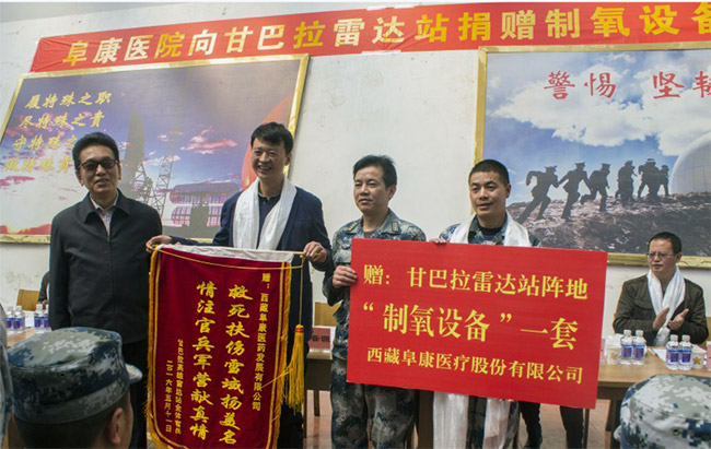 2016年5月11日,西藏阜康醫(yī)院有限公司向甘巴拉雷達站捐贈制氧設(shè)備儀式在甘巴拉雷達站營地舉行,西藏自治區(qū)政協(xié)副主席、區(qū)工商聯(lián)主席、區(qū)總商會會長阿沛·晉源,區(qū)工商聯(lián)副主席劉洪,區(qū)工商聯(lián)政研室主任張云寶,區(qū)工商聯(lián)經(jīng)聯(lián)處副處長秦林,95662部隊政治委員楊壽保,甘巴拉雷達站政治教導(dǎo)員李再華,西藏阜康醫(yī)療股份有限公司黨委書記、董事長王斌,黨委副書記、總院長張德才,黨委紀(jì)檢委員、總經(jīng)理陳彬以及甘巴拉雷達站全體官兵等出席了本次捐贈儀式。